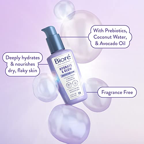 Biore Hydrate & Glow Facial Moisturizer for Dry Skin, Sensitive Skin, Infused with Coconut Water, Prebiotics and Avocado Oil, Dermatologist Tested, Fragrance Free,3.4 Oz