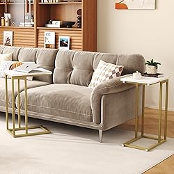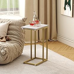 【C Shaped End Table】The side table has a C-shaped design, which is so handy to allow you easily slide the base underneath your sofa, couch or bed to hold your frequently used items, very convenient to use on both carpet & wooden floors. 【Sturdy Constructure】Our small accent table is made with a thickened metal base, stable and suitable for daily use. The quality manufactured wood surface is waterproof and scratchproof. The maximum load-capacity is up to 50 lbs. 【Space Saving】The rectangle top of the C end table is ample enough to hold phone, laptop, coffee, book, snack, drinks. The 24’’ height just fit for your couch and bed. It is easy to add to small spaces and light enough to move around. 【Height Adjustable Feet】Each side table is equipped with 4 adjustable leveling table feet, keep this snack table balanced on uneven ground, and prevent the floor from scratches. You don't have to suffer from the drink spilling anymore. 【Versatility Usage】This slim c table can easily be used as a sofa side table, under couch table, chairside table, TV tray, bedside table in the living room and bedroom. Also as a portable coffee table in the bathroom or on the patio balcony. 【Easy Assembly】Included full tools and detailed instructions, all parts are labeled, you can easily assemble this gold end table within 15 minutes, and get rid of boring and time-consuming manual labor.