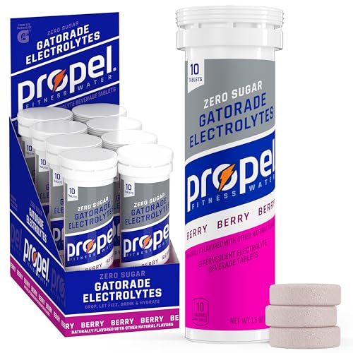 • Includes 8 (1.5oz) tubes of Propel Tablets, Berry flavor, 10 tablets per tube