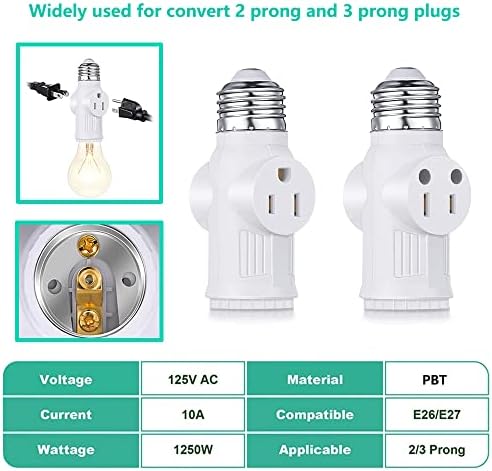 - 【3 Prong Light Bulb Socket Adapter】: Just screw in E26/E27 bulb socket to get a 3-side light bulb socket outlet, the right side for 2 prong plug, left for 3 prong plug and the upper for bulb plug. The max load power 1250W allow you to connect 3 electrical devices for simultaneous use.