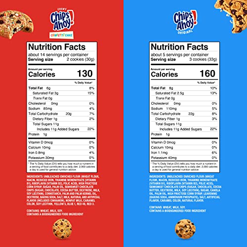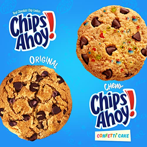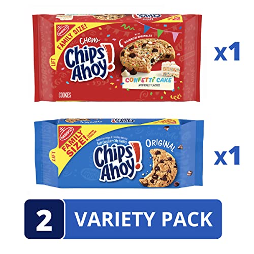 Celebrate with this CHIPS AHOY! cookie variety pack. CHIPS AHOY! Chewy Confetti Cake Flavored Chewy Cookies with Rainbow Sprinkles let you enjoy the deliciousness of confetti cake in a chewy, soft-baked cookie. CHIPS AHOY! Original Chocolate Chip Cookies are the CHIPS AHOY! cookies you know and love, baked to have the perfect amount of crunch. These crispy chocolate chip cookies are loaded with lots of real chocolate chips. Make lunches at school or work more exciting by including CHIPS AHOY! cookies or serve these crispy and chewy snack cookies as birthday cookies or party favors at your next gathering. Looking for a quick and delicious dessert idea? Try adding CHIPS AHOY! cookies to your next sundae or create delicious ice cream sandwiches. This CHIPS AHOY! bulk cookie variety pack comes with two family size resalable packs.