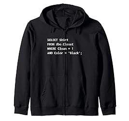 - Funny question about this design: choose shirt from dbo. Closet where clean = 1 and colour = 'black', funny SQL with select request for shirt. Perfect for programmers, DBA, database engineers, data analysts, data scientists, statisticians and data scientists working with SQL databases. This fun SQL design for programmer fun programming gift item is designed by Funny SQL for programmers.