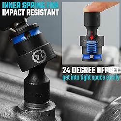 Made of premium impact grade chrome molybdenum steel construction with black phosphate finish for durability. Each socket has its own place within the EVA foam organizer, which makes it very easy to find and organize Flexible socket design allows a full 360 ° of freedom for the universal head to angle and rotate, to reach tight spaces for more better coverage The 6-Point hex socket design prevents round-off on nuts and bolts under high torque exertion and hammering stress from the use of an impact wrench or electric wrench with a strong output High-contrast size marking is permanently laser etched and easy to read, even in low light, making it easy to identify drive socket sizes and measurements to allow for fast 16-piece 3/8 " Dr. shallow impact socket set (Metric): 8 mm, 9 mm, 10 mm, 11 mm, 12 mm, 13 mm, 14 mm, 15 mm, 16 mm, 17 mm, 18 mm, 19 mm, 20 mm, 21 mm, 22 mm, 24 mm