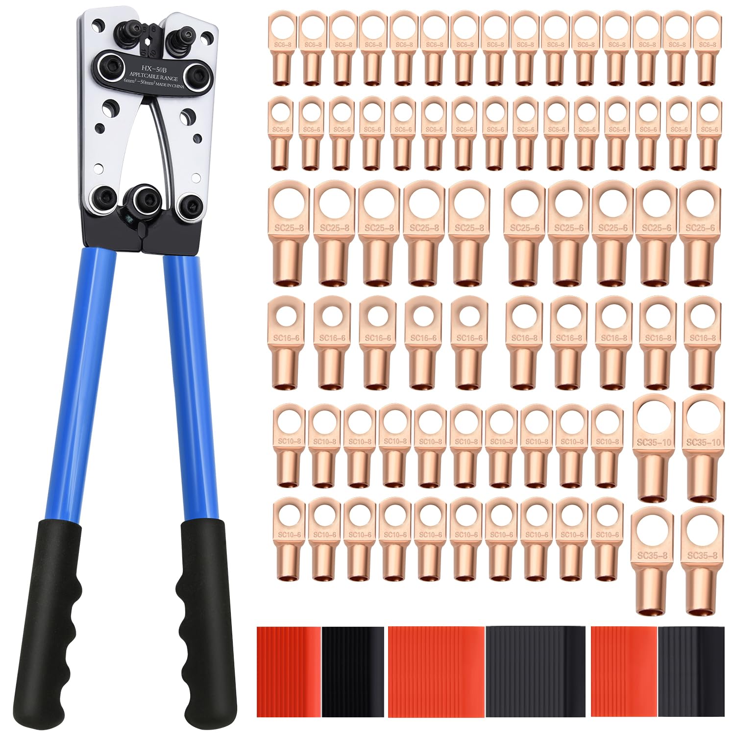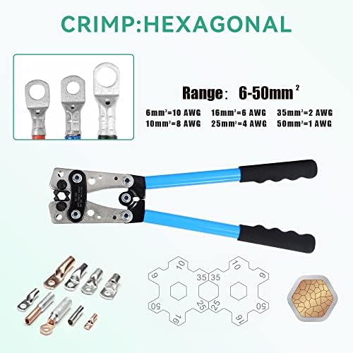 - 【Rotatable Crimp Jaw】 Secured by spring-loaded locking pins, available in 6 crimp sizes - 10, 8, 6, 4, 2, 1 AWG - (6mm²/10mm²16mm²/25mm²/35mm²/50mm²). The non-slip rubber coated handle of this tool makes working more effortless.