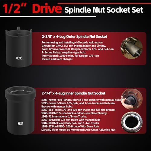- Easy Removal--- These Axle Nut Sockets use with 1/2" drive tool to remove the stubborn axle hub nut easily. The sockets with lugs teeth design provide a snug, secure fit on spindle nuts, reducing risk of stripping or damage. The lug out spindle socket allows for easy access to axle spindle nuts inside of the hub to remove the hub assembly in wheel tries repairs, suspension work, and other maintenance tasks.