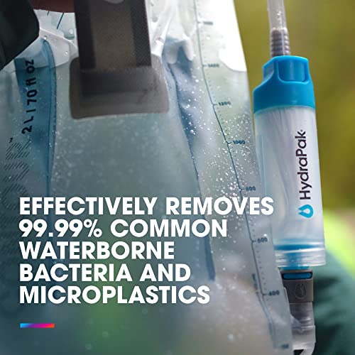 Access potable water anywhere. Convert your reservoir or water bottle into a water filter. The 28mm inline filter sets a new standard for lightweight, fast and versatile backcountry water filtration. Compatible with all HydraPak 28mm opening bottles and flasks, as well as Plug-N-Play connectors used on reservoirs and water storage containers.Avoid freezing filter. Freezing may ruin the hollow fiber membrane. Filter Kit includes:Inline FilterCap Adapter - Plugs into filter outlet allowing user to thread on their Stow or Smart Water™ Bottle cap.Backflush adapter - Plugs into filter outlet and threads onto a HydraPak Stow or bottle of clean water for backflushing the filter in order to restore its flow rate.Product use and care instructions*Effectively removes common waterborne bacteria, such as E. coli (99.9999%), and parasitic cysts (99.999%) per EPA Guide Standards and NSF P231 and microplastics (99.999%) per NSF 42 greater than or equal to 3.0 microns in size.EPA COMPANY NO.:102123EPA ESTABLISHMENT NO.: 102123°CHN°1Weights and DimsDiameter: 34 mm / 1.3 in Weight: 47 g / 1.6 oz (filter only)Length: 129 mm / 5.1 in