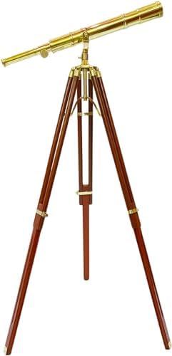 Nautical Marine Telescope Solid Brass Shiny Brass Telescope Design by Indian Artisan with Wooden Tripod Adjustable Brown Stand