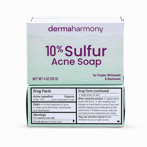 DermaHarmony's pharmaceutical grade volcanic sulfur soap is an over-the-counter (OTC) acne drug product. Sulfur is generally recognized as safe and effective (GRASE) for treating acne -- it helps to clear up, dry and reduce acne blemishes, pimples, blackheads and whiteheads. Our soap penetrates pores to reduce the number of acne blemishes. Use of 10% sulfur will help your skin to heal. Ideal for facial, butt, and body acne. Our soap is safe for daily use by adults and children. This formula is noncomedogenic and hypoallergenic. We've kept the ingredients as natural as possible. For best results use daily or as directed by your doctor. Work up a later using warm water and gently massage into affected areas. Leave in contact with skin for at least 30 seconds. Rinse well. Use on the affected skin in place of your regular soap. In case of accidental ingestion, contact a physician or poison control center immediately. Because some customers experience a drying of their skin when using this soap, start with one application and then gradually work-up to daily application. You may increase to two or three times daily if needed or as directed by a doctor. If bothersome dryness or peeling occurs, reduce application to once a day or every other day. You may follow cleansing with the natural moisturizer of your choosing. For external use only. Do not use on broken skin or large areas of skin. When using this product apply only to areas with acne. Skin irritation and dryness is more likely to occur if you use another topical acne medication at the same time. If irritation occurs, only use one topical acne medication at a time. Stop use and ask a doctor if skin irritation occurs or gets worse. Keep out of reach of children. If swallowed, get medical help or contact a Poison Control Center. Sulfur will tarnish (blacken) silver jewelry. INGREDIENTS: Saponified Oils [Sodium Palmate, Sodium Cocoate and/or Sodium Palm Kernelate], Water, Sulfur, Glycerin, Sodium Chloride (table salt), Elaeis Guineensis (Palm) extract, Pentasodium Pentetate. OTHER INFORMATION: Made in the USA. Use within 12 months of opening package. Each bar is individually wrapped or boxed. The polypropylene bar wrapper is Type 5 Recyclable. NDC Code 71819-014-004.