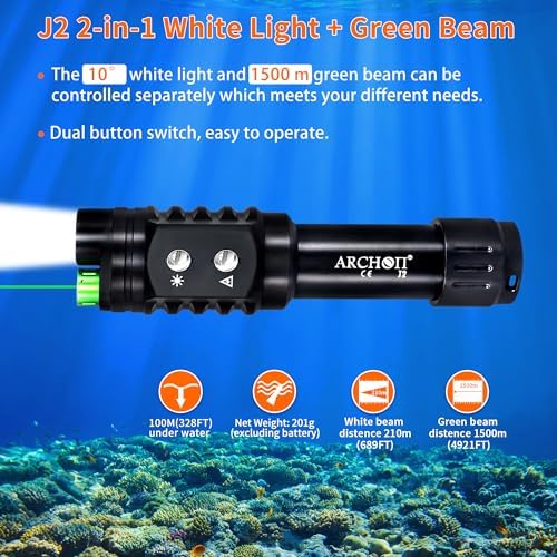 ARCHON J2 Diving Flashlight, 2-in-1 Scuba Dive Light with 1200 Lumens White Spotlight,1500 Meters Green Beam, Underwater 100 Meters Waterproof, Dual-Button Switch