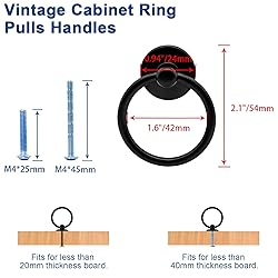 - Feature: Featured with matte black finish, the hardware cabinet ring pulls are easy to hold and pull out the drawer. Easy to install by drilling mounting holes and screw-on with screws included for installing. Specification: Size: 1.6" x 2.1" /42mm x 54mm (Dia.*L) Bottom Diameter: 0.94"/24mm Screws Length: 45mm & 25mm Finish: Matte Black Material: Zinc Alloy & Iron Quantity: 12 Pieces