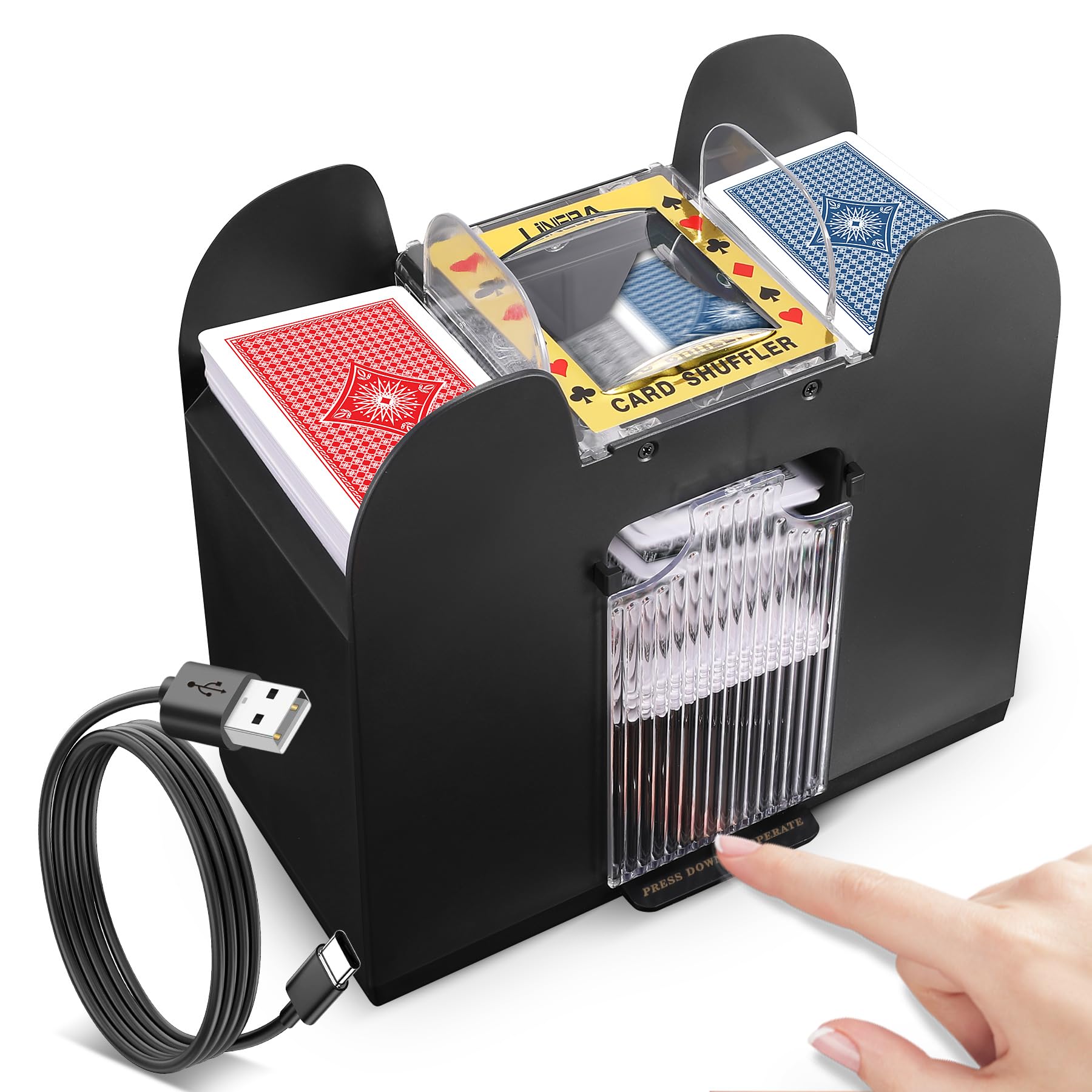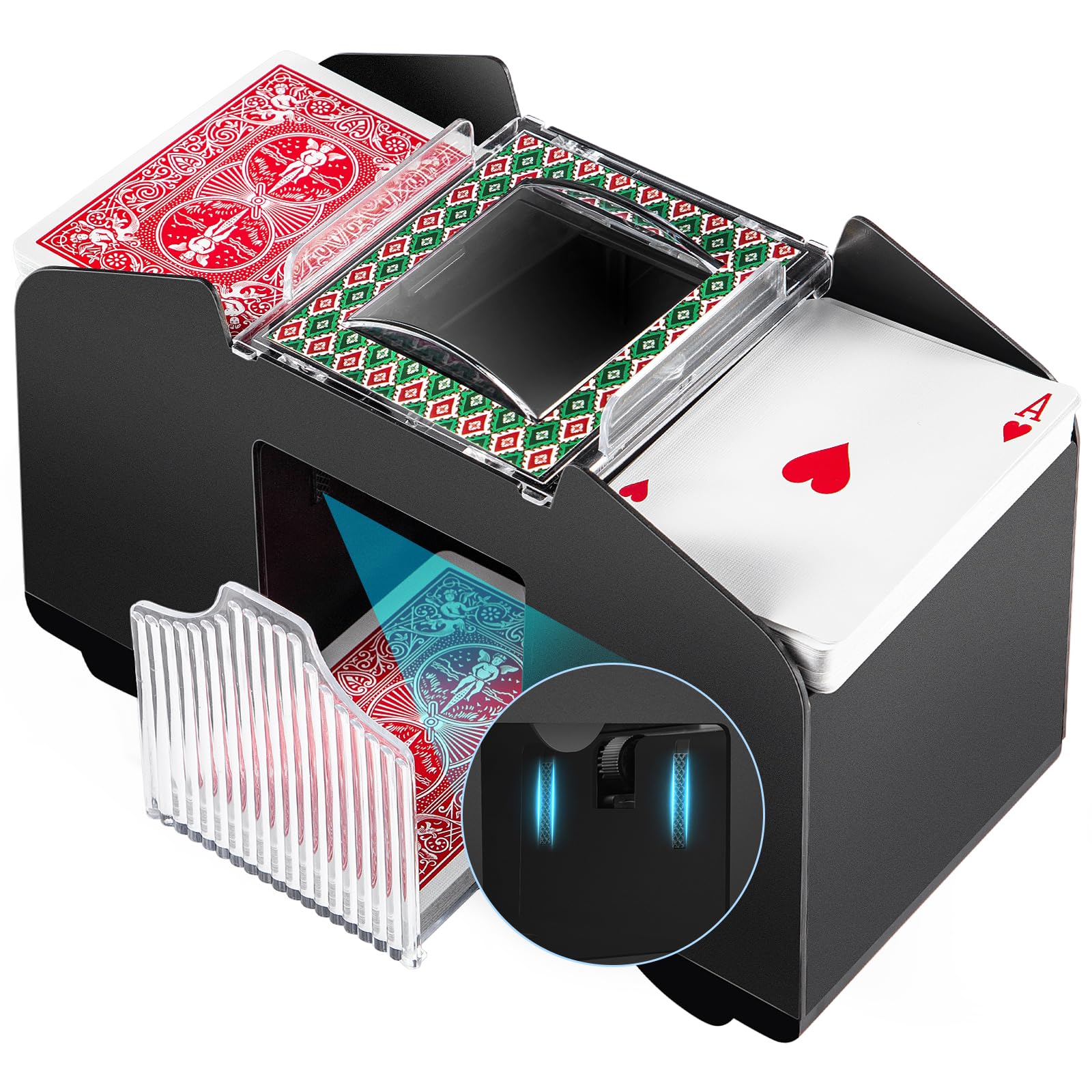 - 【Gran Opción para Juegos de Cartas】Hecho con el material ABS más fuerte, el mezclador de cartas automático Unniweei con alta velocidad de mezcla es perfecto para Juegos de Cartas de Casino para Poker, Juegos de Cartas para Casa, UNO, Phase10, Texas Hold'em, Blackjack, Juego de Club de Fiesta en Casa. El mezclador de cartas puede barajar y recoger rápidamente y suavemente las cartas de juego en la bandeja. Después de insertar las cartas en las aberturas en ambos lados del producto, se mezclarán automáticamente con un solo pulsación del botón.