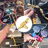 【Wide Usage】--- The quick coupler access tee adapter can be used for refrigerant charging system, for easy charging without a gauge manifold, vacuum and charge faster, just need a refrigerant hose with a low loss ball valve so you can open and close one end the hose. 【Well-Design】--- 1/4’’ HAVC tee adapter with swivel connector to hook up a vacuum gauge, the female end has a shrader valve core depressor, also with higher quality seals to prevent leakage efficiently. 【Brass Tee Adapter】 --- 1/4'' valves core tee adapter is made of high quality brass with durable construction, which can ensure safety and long-lasting to use. 【Easy Installation】--- The HAVC T-shaped adapter is easy to operate and install, installing on a truck, installing a pressure gauge or connecting a vacuum pump, has a strong seal, high durability and safety, prevents leakage and saves your time. 【Free-Worry Warranty】--- Order quick tee adapter, we can provide 12 moths free-worry warranty, if you have any questions about our product, please contact our customer service and will reply in 24 hours.