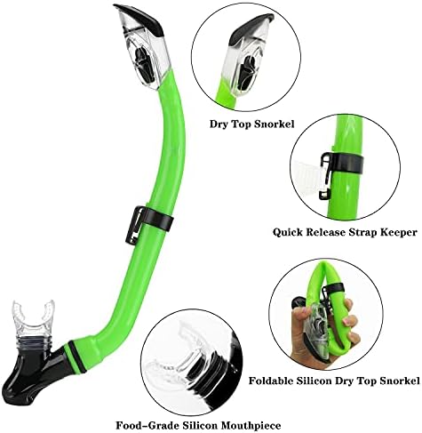 - FOLDABLE SILICONE FULL DRY SNORKEL: This kids snorkel mask comes with a pair of earplugs, using a transparent hard PP storage box, and the whole breathing tube is made of silicone material. The snorkel can be folded during carrying, which is more space-saving and portable; it can be bent during use, making this dive set more suitable for children. More importantly, you don’t have to worry about the naughty kid not taking good care of their snorkeling set and breaking it easily