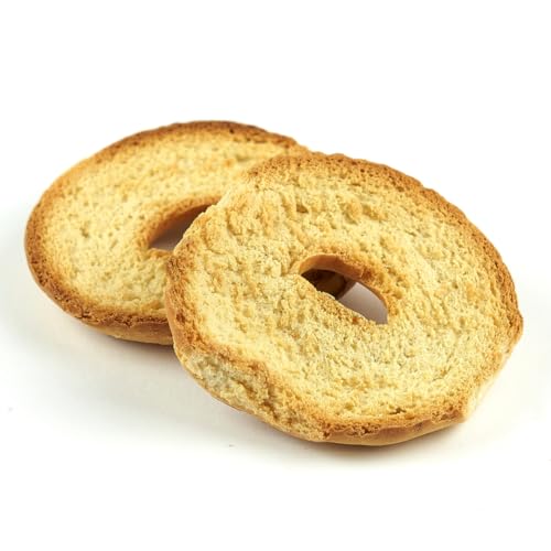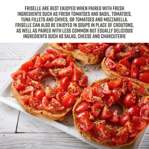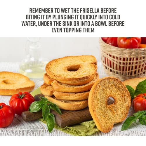 The Italian Frisella, also called fresella or frisa, is a large, round piece of dry, double-baked durum wheat flour, often with a hole in the center. The Frisella dough is made from durum wheat flour, water, salt and yeast, and is cut and rolled in a shape reminiscent of the bagel. After the first baking in a wood oven, it is cut in the middle with an iron wire and the two sides are baked again. Frisella is very tough to eat on its own, and in fact it is commonly considered sort of an edible plate, to cover with food. For this reason you necessarily remember to wet the Frisella before biting it by plunging it quickly into cold water, under the sink or into a bowl before even topping them. The frisella absorbs the liquid very fast so in a matter of seconds your frisella will be ready to add your seasonings and condiments. Friselle are considered a good fat-free substitute for bread and are a good option for the diet. Friselle are best enjoyed when paired with fresh ingredients such as fresh tomatoes and basil, tomatoes, tuna fillets and chives, tomatoes and mozzarella, etc. Friselle can also be enjoyed in soups in place of croutons, as well as paired with less common but equally delicious ingredients such as salad, cheese and charcuterie. Whatever your preferred topping, remember to dip them into water before seasoning and eating them.
