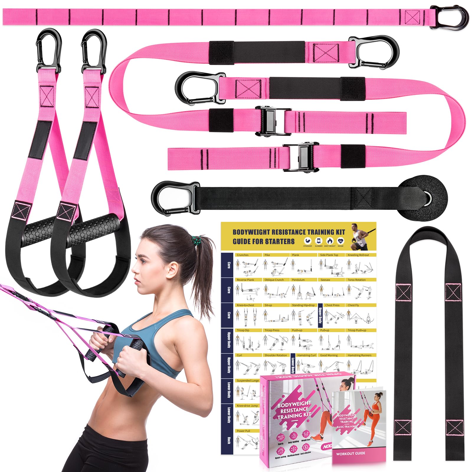 - [Indoor & Outdoor Resistance Training] All-in-one full body strength resistance training kit with door anchor and extension Strap. You can use the bodyweight resistance trainer kit with horizontal bars, wall, doors, sturdy beams, weight racks, heavy bag mounts, railings, trees, fences or any sturdy and safe object for exercise, as well as aerial yoga training.