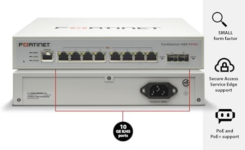 Fortinet FortiSwitch 108F-FPOE Layer 2 Switch. Managed. 8XGE Port, 2X SFP Port, 1X RJ45 Port. Fanless Design