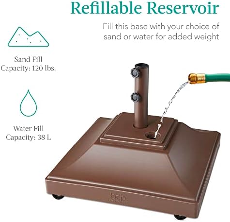 - REFILLABLE RESERVOIR: Fill the hollow chamber with 120 pounds of sand or 38 liters of water, then use a pair of tightening knobs to secure your umbrella