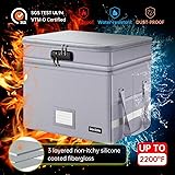 Three layered non-itchy silicone coated fiberglass+High quality PP boards Fireproof and Water-resistant: The multi-Layer rolling fireproof file box is made of 3 layered non-itchy silicone coated fiberglass which stands up the temperature up to 2200℉.It has been passed by SGS TEST(UL94 VTM-0 Certified).The file lock box is fireproof and waterproof, which can effectively protect your important documents in a fire, flood, and wet weather. They will further keep your files intact. Nothing is completely foolproof, but added protection is always a good idea. Multi-Layer&Large-capacity(16"x13.8"x12.2"): Compared with other file boxes, our fireproof file box adopts a multi-layer design that can meet all your storage needs. These include 8 passport mesh bags, 16 card slots, 4 U disk pockets, 2 mesh bags, 4 outer pockets, 1 large pocket, and one main pocket with large space. They are ideal for storing cards, passports, CDs, USB, albums,certificates and other valuables.The main pocket can fit both letter and legal-size files or anything else you want. Innovative Design: Compared to other materials used in boxes which tend to itch and stick to dust,the Dust-proof material we use prevents dust from sticking to the outside of our file box,always keep it neat and tidy.The reflective strip design allows you to immediately find your box even at night,protecting files and valuables from fire.Fireproof document box uses different boards than other box,High quality PP boards won't warp.It can collapses down simply for easier storage when not in use. Combination Lock Protection: Compared with other file boxes,our multi-Layer File Box can lock documents and items in separate compartments for security. High-quality password lock provides maximum security for your valuables such as contracts, cards, certificates, conference materials, passports, etc. The package includes an instruction manual for lock(You can choose to lock only one compartment or lock them all).The double zipper design makes it easier to open and close. No keys required. Movable&Portable: Our file box is lighter than other boxes and in the event of a disaster, the adjustable sturdy handle makes it easier to move and carry around,You can put it in your home, office, car or outdoor activities. The bottom of the box has four non-slip feet can better protect the box from wear and tear. Combining our fireproof document box and other fireproof products together is the best solution to offer your documents and valuables a complete protection in any fire accident.