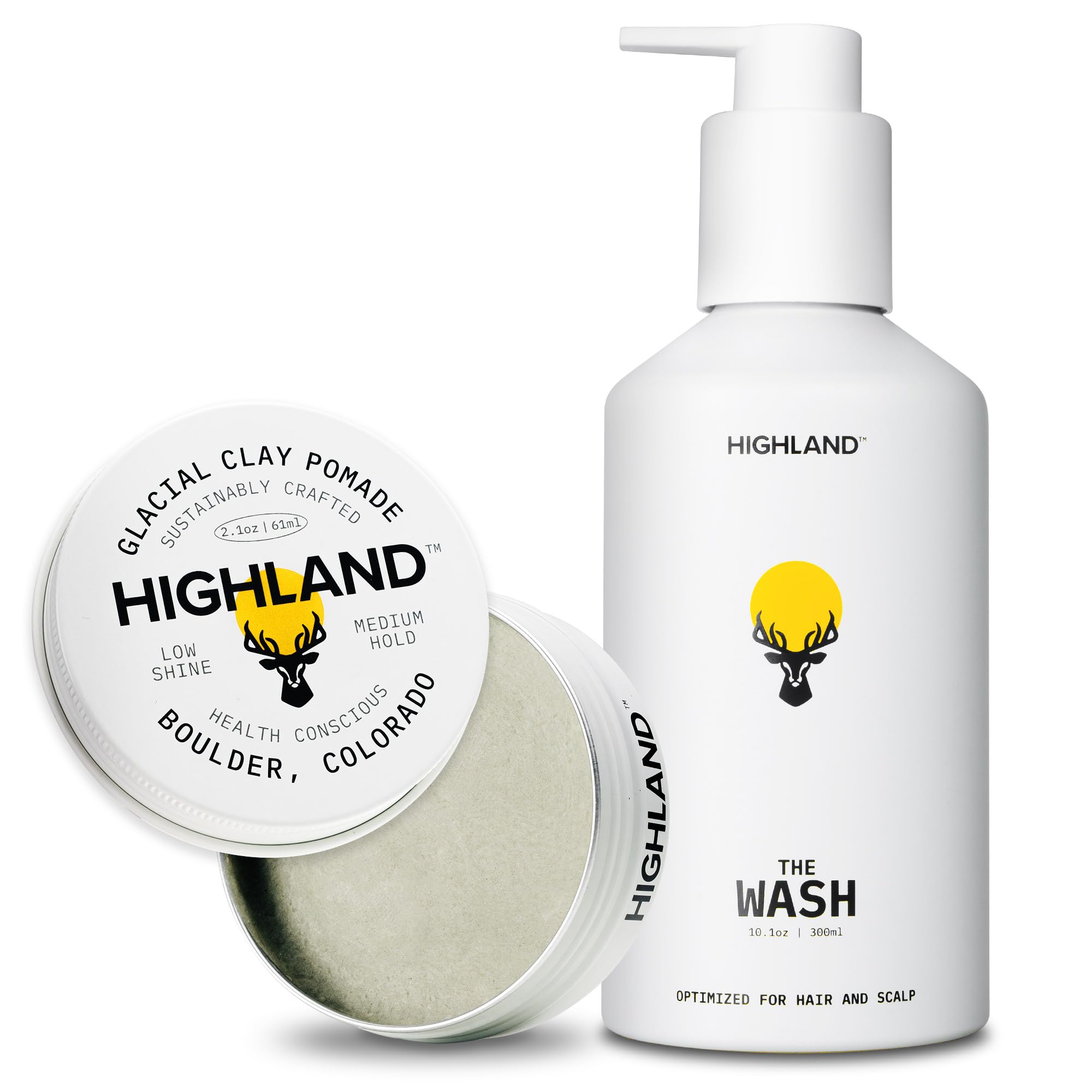 Highland Glacial Hair Clay Pomade - Award winning hair styling clay for men and women made with 100% all natural and organic ingredients that promote hair and scalp health. Low shine, Medium Hold.