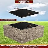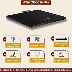 Comfortable & Controlled Handling: This fire pit lid square Features sturdy wooden handles that stay cool to the touch, offering better grip and easier lifting for safe fire pit coverage and removal. High-Quality Material : Our fire pit snuffer lid steel pan cover square is built with high-quality steel material of 1.5mm thickness. This outdoor fire pit lid square measures 38” diameter in size. Made for Outdoor Durability: Built from carbon steel, the square lid withstands regular exposure to outdoor elements, making it a dependable choice for long-term use. Designed for a Secure Fit: Measuring 38 inches across, this fire pit insert square lid offers full coverage for fire pits up to 36 inches, helping prevent moisture buildup and reducing prep time before use. Reliable Outdoor Protection: A powder-coated, rust-resistant finish helps defend against harsh weather, falling debris, and daily wear—keeping the fire pit surface clean and dry.
