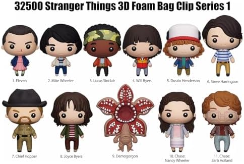 Try to collect all 11 characters from the Stranger Things 3D Foam Bag Clip Series 1 collection in Blind Bag: Eleven, Mike Wheeler, Lucas Sinclair, Will Byers, Dustin Henderson, Steve Harrington, Chief Hopper, Joyce Byers, the Demogrogon, and two more special characters. Each blind bag comes with 1 character bag clip accessory that averages to about 2.5 inches in height without the bag clip. Keychain is made of 3D Foam and PVC. Imported from China.