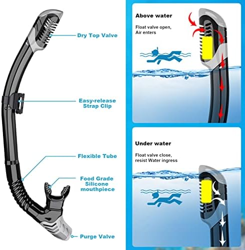 - [Easy Breathing Dry Snorkel] Continuous effortless breathing can greatly enhance your snorkeling experience, particularly for beginners. The snorkel features a dry float valve that seals the tube to block water entry when it submerged in water. Made of food-grade silicone, the mouthpiece is soft and comfortable for you to breathe and make it easy to clean the water from the mouth via the lower purge valve. Besides, the upgraded buckle allows you easily connect the snorkel with the mask.