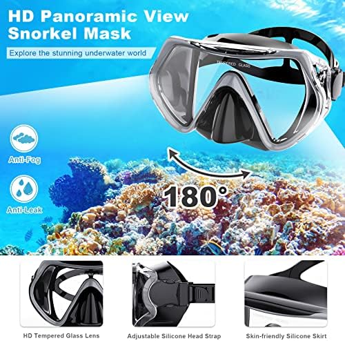 - [180° Panoramic View Snorkel Mask] The Panoramic window design and durable anti-fog tempered glass lens of the diving mask provide users with wide-clear vision and secure eye protection. This snorkeling mask features an upgraded soft elastic skirt and an easy-adjust buckle system, which can prefect fit various face shapes with reliable watertight seal and maintain comfort during extended periods of underwater use.