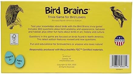 Test your knowledge about birds with the Bird Brains trivia game! Includes 300 questions about bird anatomy, appearance, behavior, habitat, and other interesting facts about birds in history, art and culture. Fun and educational for bird watchers or anyone who loves nature and the environment! Questions in this edition are focused on bird species found in North America. Package includes 300 question cards, category divider cards, die, timer, score pad, and game rules/instructions. Proudly made in the USA, and responsibly produced with recycled and Forest Stewardship Council-Certified materials.