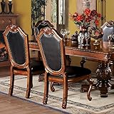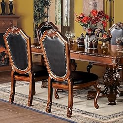 - The Traditional Dining Collection features elegant styling decorative carvings and a combination of hardwood and veneers. The double pedestal dining table, upholstered chairs are all accented by decorative base and shell motifs. This collection will be the showpiece of your dining room environment. 7-Pc Dining Extension Table Set Include 1-Pc Dining Table, 4-Pc Side Chairs and 2-Pc Arm Chairs Dining Table ✔Pack: 1Set/2Ctn ✔Finish: Cherry Finish ✔Material: Wood, Poly Resin, Veneer (Wood), Composite Wood ✔Dimensions: (66"-96") L X 46" W X 31" H, 2 x 15" Removable Leaf ✔Net Weight: 229 lbs ✔KD, Rectangular Double Pedestal Table NO Storage Extension Leaf: Removable (2 x 15") Side Chair ✔Pack: 2Pc/1Ctn ✔Finish: Black PU & Cherry Finish ✔Material: Wood, Upholstered (Seat) ✔Dimensions: 23"L X 28"W X 45"H ✔Net Weight: 44 lbs ✔KD, Armless Chair (High Backrest) Stationary Seat: Standard Dining Height Padded SEAT & BACK: PU Cushion (Solid Pattern) Arm Chair ✔Pack: 2Pc/1Ctn ✔Finish: Black PU & Cherry Finish ✔Material: Wood, Upholstered (Seat) ✔Dimensions: 28"L X 28"W X 45"H ✔Net Weight: 53 lbs ✔KD, Arm Chair (High Backrest) Stationary Seat: Standard Dining Height Padded SEAT & BACK: PU Cushion (Solid Pattern) Package Included: ✔1-Pc Extendable Dining Table ✔4-Pc Side Chairs ✔2-Pc Arm Chairs