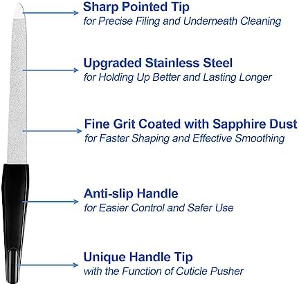 - Designed for Better Control: Our nail file features an anti-slip handle designed for comfortable and easy use. The sharp pointed tip effectively cleans dirt beneath the nails, while the fine grit on the top gently shapes and smoothens your natural nails with less effort.