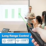 [Presentation Clicker with Green Laser Pointer] PowerPoint clicker controls range:98FT/30M, laser pointer range: 328FT/100M. Clicker for laptop presentations allows you to circulate through the room instead of being tied by the laptop and projector screen to make emphasis on important points. [Wonderful Ergonomically] Wireless presentation clicker for PowerPoint presentations has a amazing ergonomic design that makes you soft touch and comfortable to grip ,and presentation pointers' buttons are big enough that you won't accidentally click the wrong one. [Plug and Play] No installation needed, no assembly or hard instructions to follow. Just plug and play. You simply plug the USB receiver into your computer and start using the laser pointer for presentations. The USB dongle slips into a slot on the PPT remote control handle when not in use. [Widely Compatible] Wireless presenter with laser pointer works with desktop and laptop computers. Presentation remote supports systems: Windows 2003, XP, Vista, 7, 8, 10, Mac OS, Linux. Wireless presenter remote supports softwares: Google Slides, MS Word, Excel, PowerPoint/PPT, etc. [Long Battery Life] Presenter remote just uses two AAA batteries(included), which is convenient because then you don't have to buy odd size batteries. Power point remote clicker is sturdy enough to throw in a briefcase or bag. Tips: Slide clicker has an on/off switch on the side to save the battery when not in use.