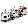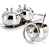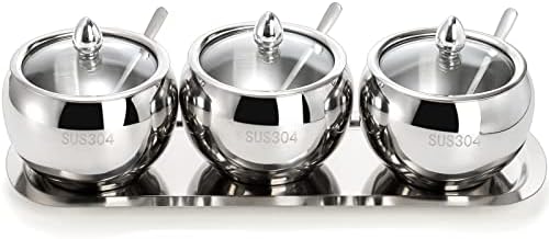 - Sugar Bowls Set - Come with 3 grids stainless steel seasoning containers with spoon, glass lid and tray. Suitable for serving sugar, pepper, salt, spice, etc.