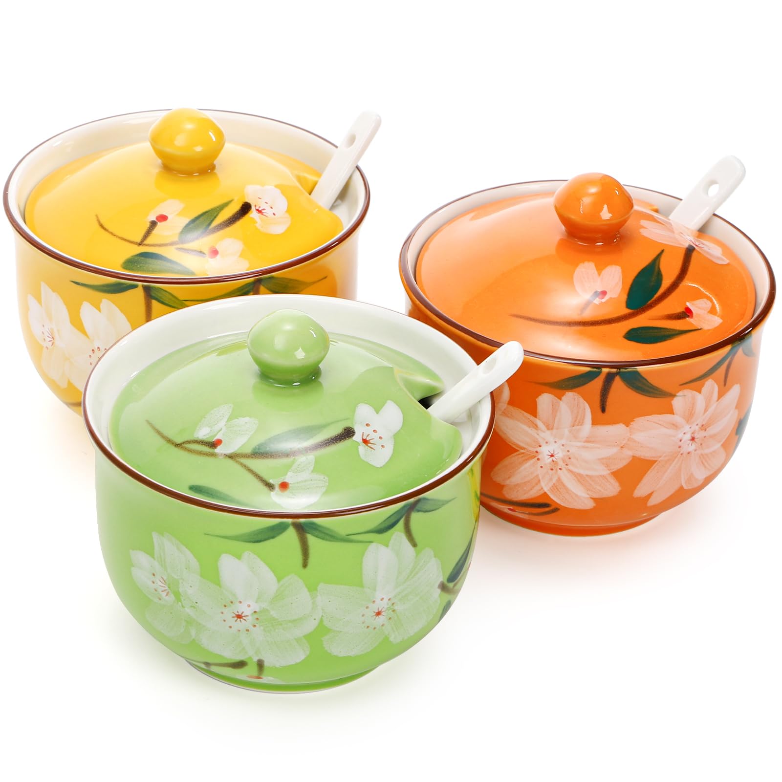 - Sugar Bowls Size - The storage tank set includes 3 containers of the same size (3.5"*3.5"*3.5"), 3 spoons(4.5"*0.8") and 1 tray(11.6"*4.1"*0.8"). Each jar has a capacity of 10.5 oz.