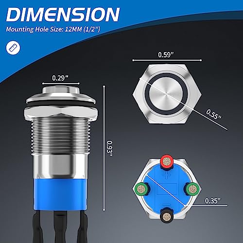 - 【12V & 12MM Button Switch】 - The rating of this metal push button switch is 12V, 5A. And the required mounting hole size for this 12v push button switch is 12mm.