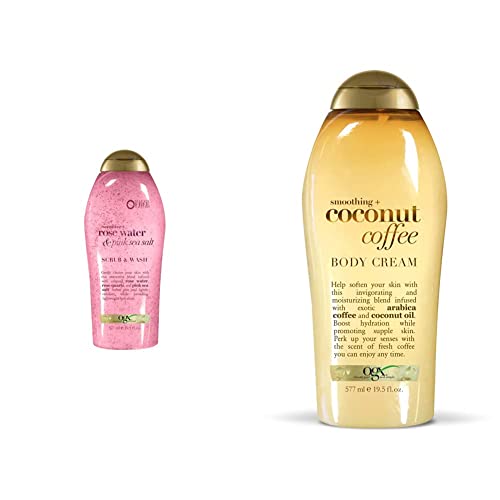 Treat your skin to this luxurious bundle from OGX featuring a smoothing body cream and a gentle exfoliating body scrub. The 19.5 oz coconut coffee body cream moisturizes with a rich blend of coffee and coconut oil to leave skin feeling silky smooth. It combines the softening benefits of coconut oil with the skin-awakening properties of arabica coffee. Paired with it is a 19.5 oz bottle of calming rosewater and sea salt body scrub. This sulfate-free scrub nourishes skin with a foaming lather of rosewater and gently buffing pink sea salt crystals to reveal softer, more supple skin. Its lightweight formula is especially kind to sensitive skin types. Together these OGX formulas provide a ritual to gently smooth and revive skin. The coconut coffee cream's exotic scent transports the senses while the rosewater scrub calms. An invigorating and soothing bundle for all skin types.