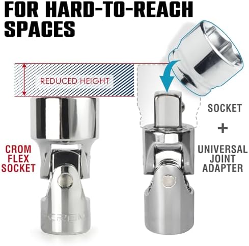 CROM Universal Flex Socket Set - 3/8 Inch Drive 6-Point 10-Piece Swivel Socket Set from 10mm to 19mm Metric - Swivel Joint for Easier Access to Tight Spaces - Aluminum Socket Storage Rail Included