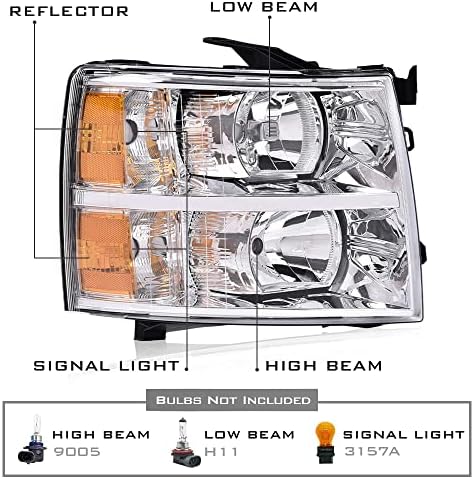 G-PLUS Headlights Assembly Compatible with Chevy Silverado 2007-2013/Fit Chevy Silverado 2500 HD 3500 2007-2014 Bumper Headlamp Right Passenger Side Clear lens Chrome Housing Amber Reflector