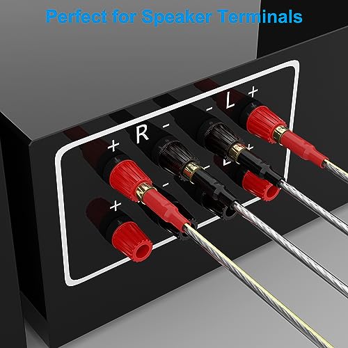 • 【Polarity Differentiation Design】: 16 Gauge speaker wire with banana tips come with a soft transparent jacket and yellow polarity marker. In addition, polarity can also be distinguished by the color of the connector, with red banana tip is positive and black banana tip is negative. Suitable for professional stage speakers, A/V receiver, speaker applications, stage monitors, passive speakers, home stereo sound systems, subwoofers and more.