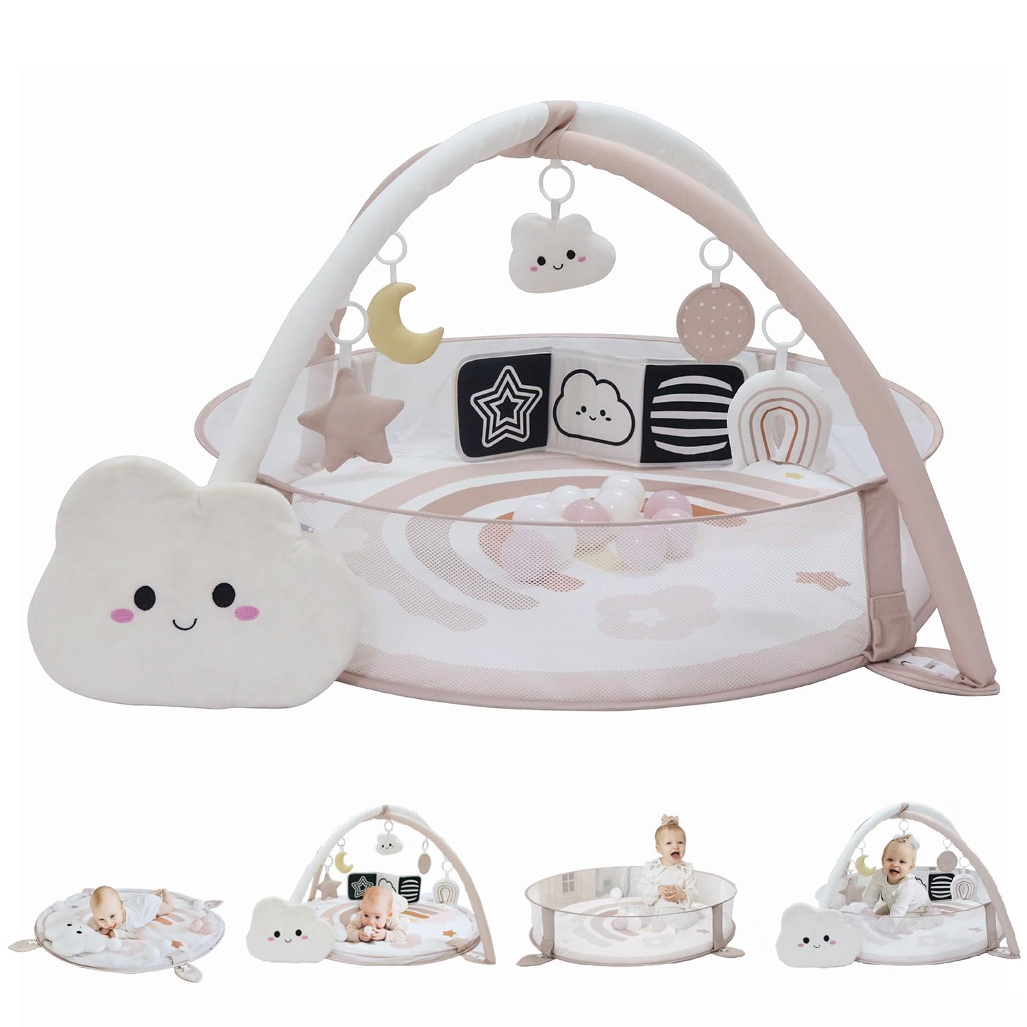 - {Adaptable} This versatile baby playmat encompasses 6 different uses: tummy time mat, baby activity center, pop up mesh fence, high contrast book, ball pit with balls included and lamb storage bag. Engineered to align with your baby's developmental stages, this mat will capture your baby's attention providing hours of both entertainment and learning. Caution: Always ensure adult supervision during use.