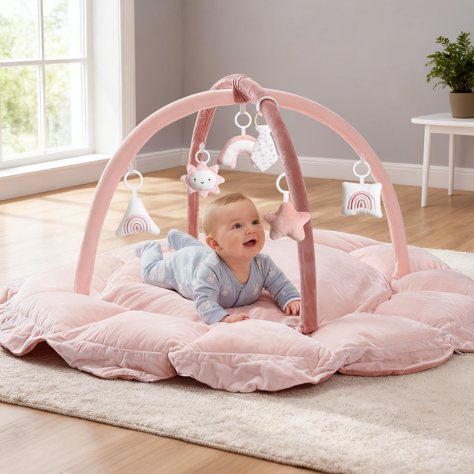 - {Sensory Toys} This enchanting baby play mat activity gym includes 5 hanging accessories perfectly catering to the evolving requirements of a baby's visual, auditory, tactile, cognitive, and physical development, ensuring extended periods of engagement and amusement. Making this a perfect tummy time play mat and baby activity mat.