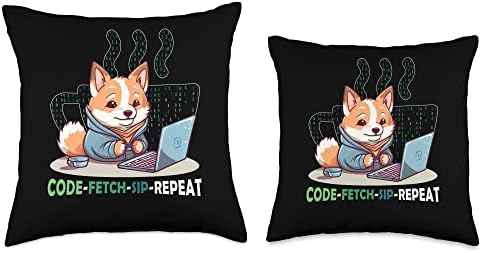 Funny Programming Humor Binary Code Designs Code Fetch Sip Repeat Coffee Binary Shiba Inu Programmer Throw Pillow, 16x16, Multicolor
