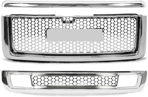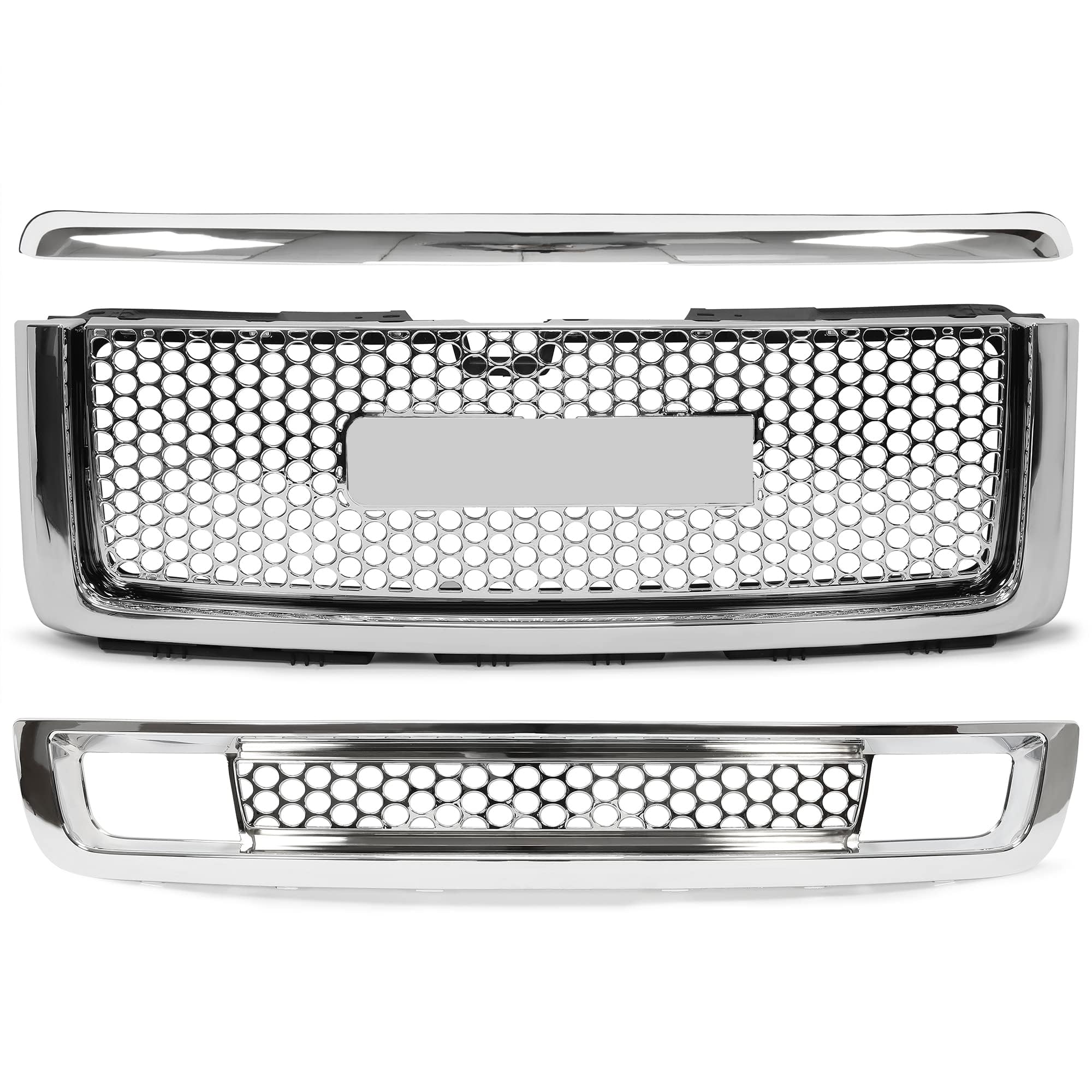 KUAFU Grille 3PCS Compatible with 2007-2013 GMC Sierra 1500 Denali Round Hole Mesh Front Hood Molding Top & Upper & Lower Grill Front Bumper Center Grill Chrome Silvery