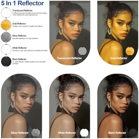 - 【5-In-1】 A 32’’/80cm 5-in-1 interchangeable reflector (silver/gold/white/black/translucent) lets you bounce light with ease: silver to reflect light without distorting color; gold to warm up, recommended for outdoor shooting; white to soften light and preserve natural color; black to absorb light and creates dark effects; translucent to diffuse light and eliminate shadows.