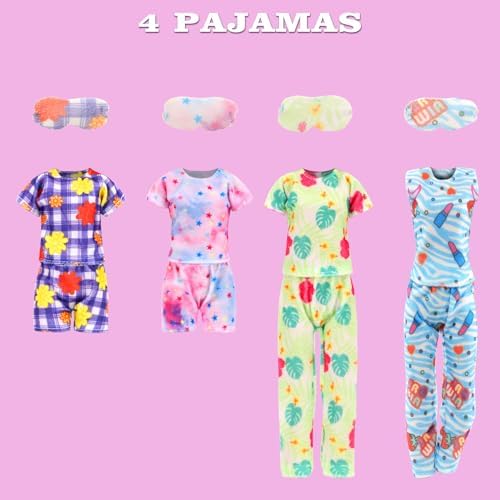 - Casual Pajama Set - 4 Pajamas + 1 Pink Bathrobe + Headscarf + 1 Pink Bathrobe + Headscarf + 3 pairs of Slippers ( Pink + Red + Blue ) + 4 facial masks + 3 eye masks. These girl doll clothes and accessories are fits for 11.5 inch (30cm) doll.