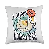 100% Polyester I Work On Computers Funny Cat Lover Computer Programmer Programming Coding Design. Artwork for kitty kitten lover, animal lover, cat whisperer, fur parent, pet owner, IT technical support, coder, hacker, software app developer, network engineer, geek, nerd This awesome illustration with a cute graphic art style is perfect for tech-savvy men, women, boys, and girls who love cats and other mammals. 100% spun-polyester fabric Double-sided print Filled with 100% polyester and sewn closed Individually cut and sewn by hand Spot clean/dry clean only