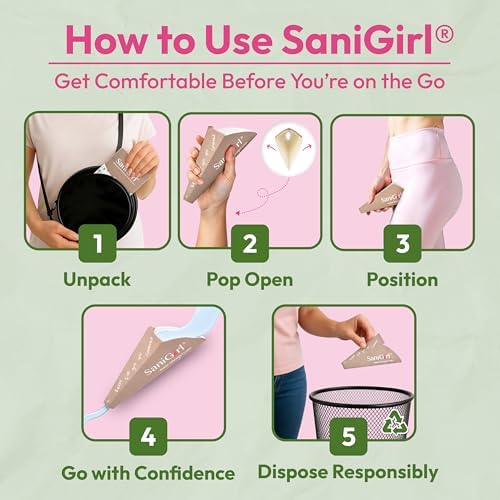 - NO MORE PEE PANIC OR RESTROOM FEARS - STAY STRESS FREE AND CLEAN ANYWHERE. Peeing on the go is a problem for females. Public restrooms are unhygienic and gross; hovering outdoors is uncomfortable and messy. SaniGirl female urinals for women solve that! Pee standing up anywhere. SaniGirl disposable sanitary funnels are must have travel essentials for any go girl. A practical, clean, easy pee accessory for camping for women, music festivals, glamping essentials and road trip essentials for adults.