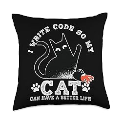 100% Polyester I Write Code So My Cat Can Have A Better Life Design. Make a special birthday gift for all the Cat Lovers. This design is designed for all the Cat Fans. You will like this cool designs. Great Design! Perfect Birthday, Back to School, Easter, Halloween, Thanksgiving, American patriots or Birthday gift. For everyone who loves a funny design. Cool design for the next gift! 100% spun-polyester fabric Double-sided print Filled with 100% polyester and sewn closed Individually cut and sewn by hand Spot clean/dry clean only