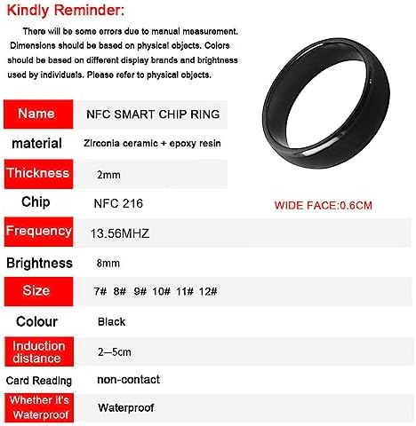 eadable cards: Because of readable and writable features, NFC tags allow people to change and read the data when you want, the chip inside can quickly read the data, please notice that a NFC-enabled device is needed. Suit occasion: You can use NFC 216 blank card to set a alarm clock, turn on and off WiFi, make a call, launch an application, join a network, show a message, share a contact, show address or location, update social media, open a web page, etc.. Features: Product features: Product chip: nfc216 Product frequency: ic 13.56 Ring color: black on outer surface Ring width: 6mm Ring size: Standard American Ring Sizes 7 to 13 are available Applicable crowd: male and female Packaging: a beautiful ring and ring box Material: zirconia ceramic+epoxy resin colour: black Reading distance: 1 cm to 5 cm (depend on the reader and using environment) Function: read and write Data storage time: more than 10 yearsPackage Includes: 1NFC smart ring Warm notice: Some phones are unable to read the nfc tags, please understand it clearly before making purchase.