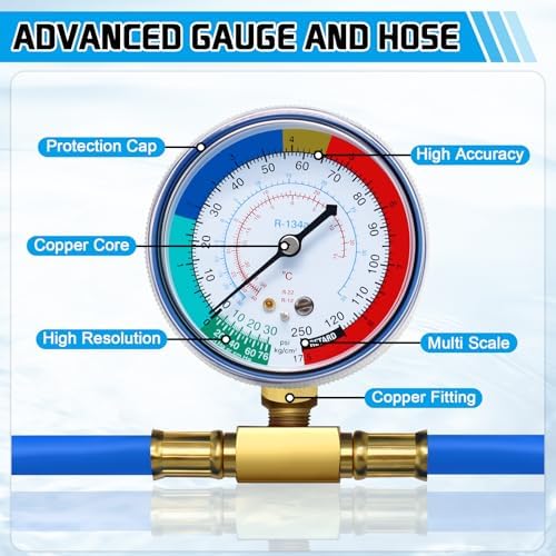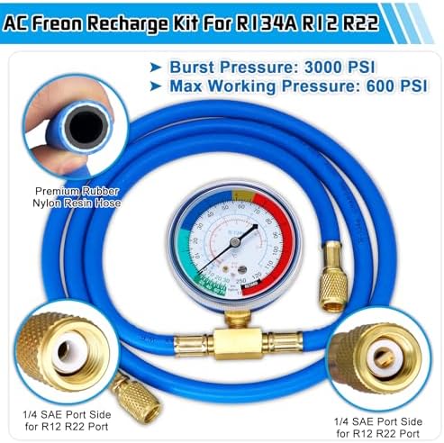 - 【R134a Recharge Hose】AC charge hose kit with gauge for R134A R12 R22 refrigerant to vehicle or home air-conditioning, extra large and colored dials with centigrade scale is easy to read, gauge rated 250psi max pressure, hose rated 3000 psi burst pressure and 600 psi max working pressure.