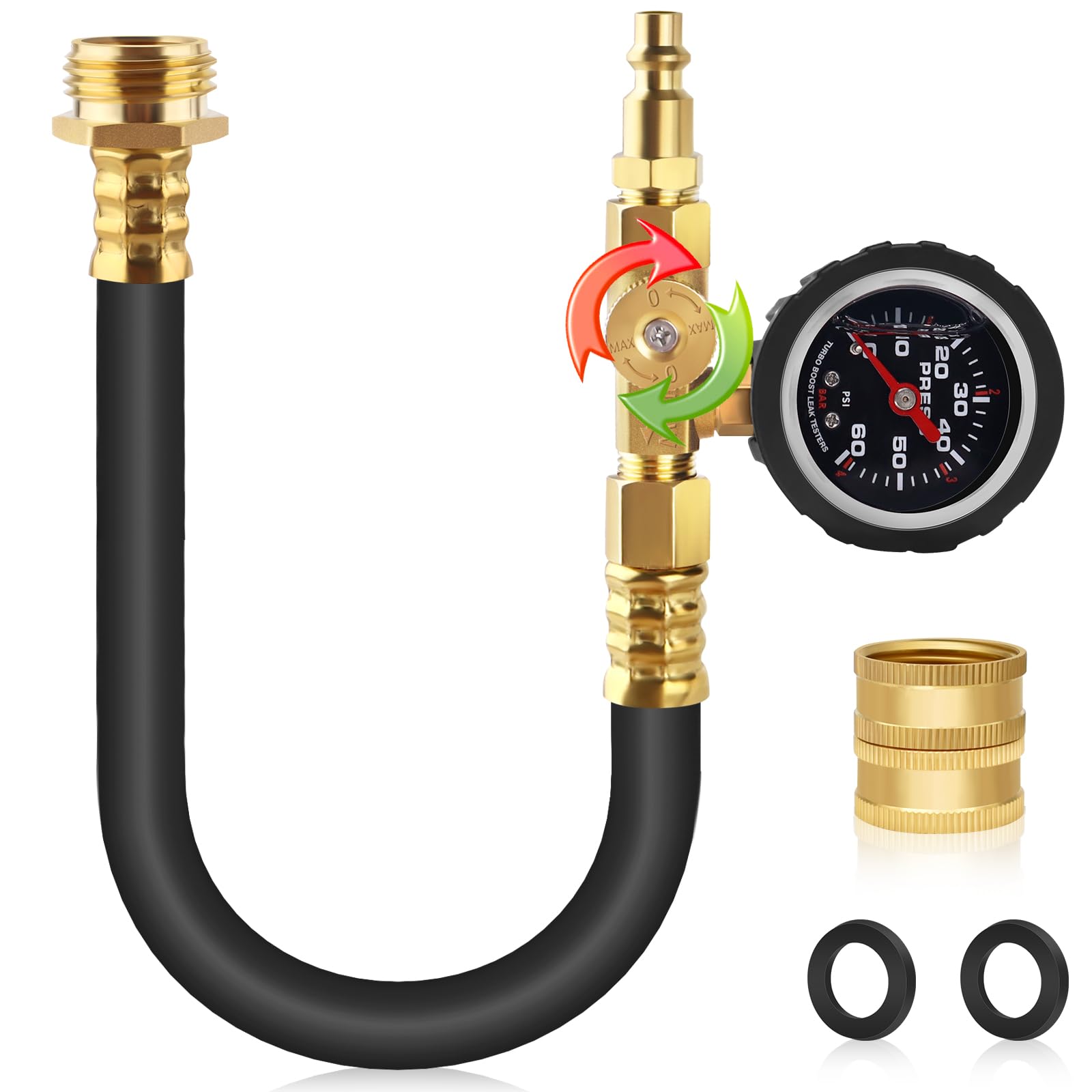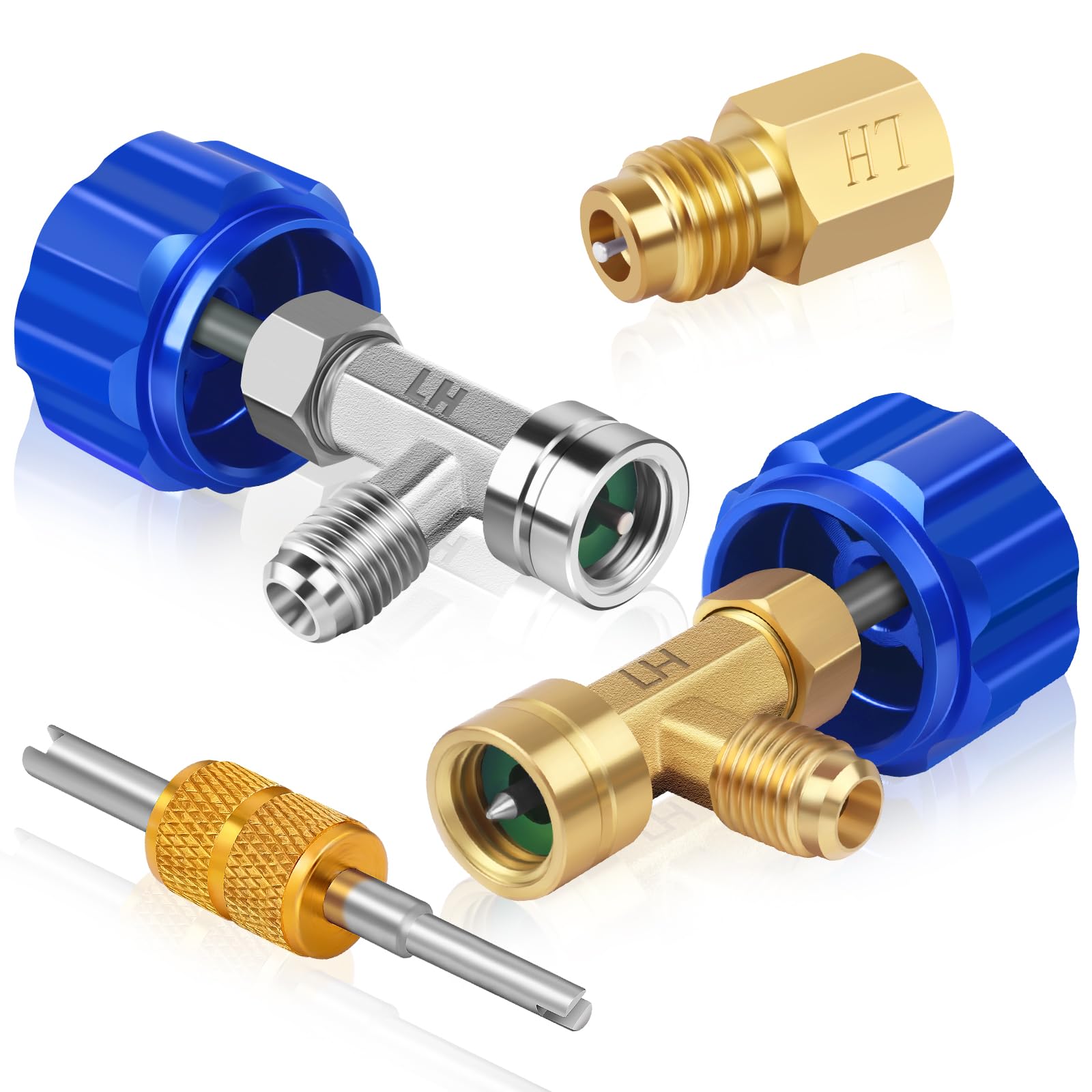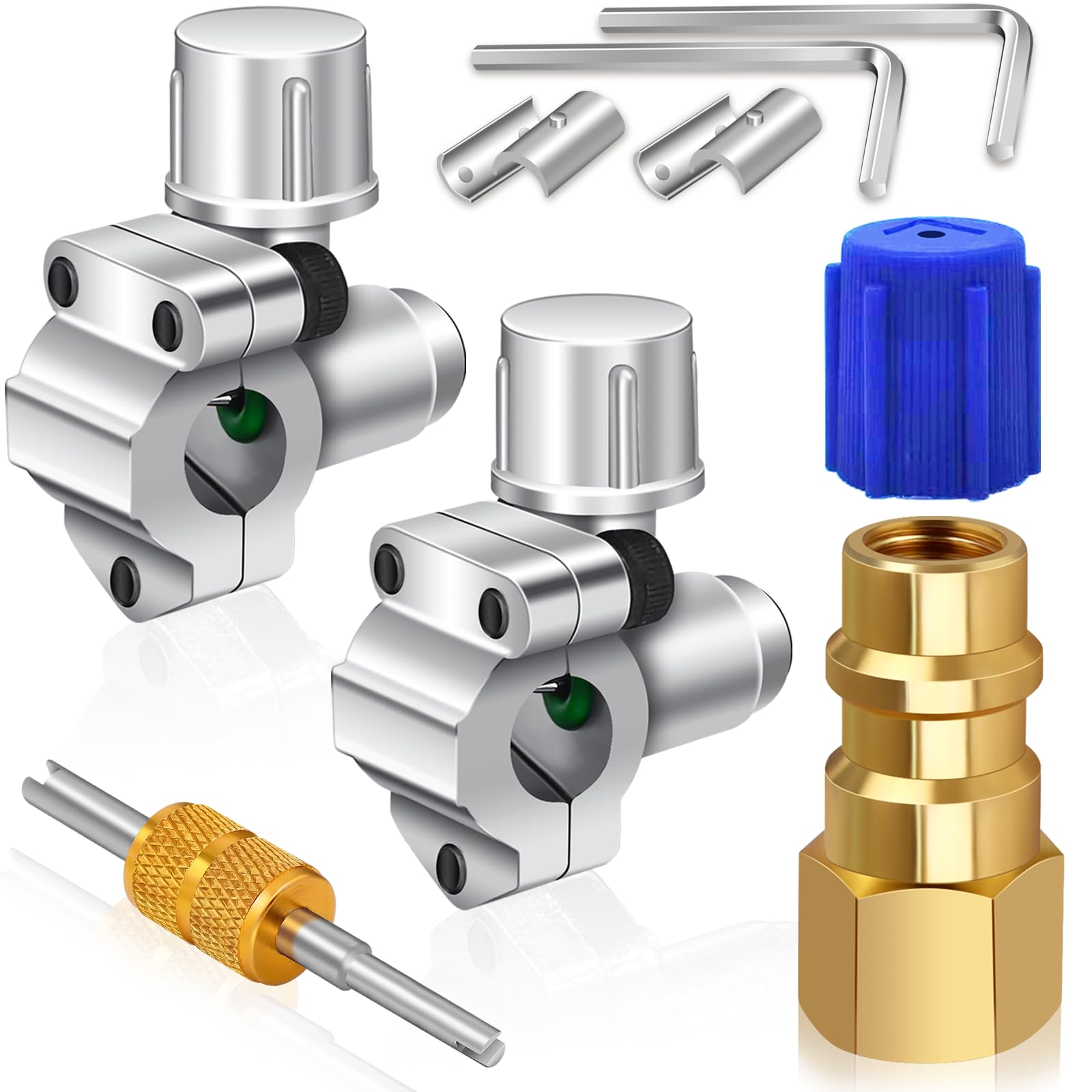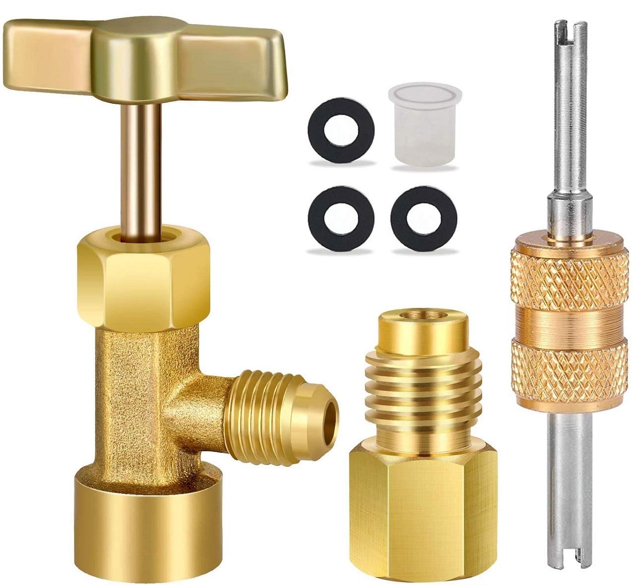 - 【Can Tap Valve】 Two R134a can taps with red handle in freon recharge kit are equipped with piercing and self sealing style which help to compatible with all R134a cans, also has a R12 self sealing can tap with black handle. They are all made of quality brass, which has good durability and anti-rust, T handle for easy fingertip control, thickening seals to prevent leaking.